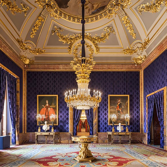 La llamada antecámara oficial, o Pieza de Etiqueta de Carlos IV, es una preciosa habitación enfundada en terciopelo de seda azul con el emblema de la casa de Borbón, la Flor de Lis.